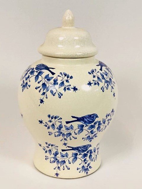 POTICHE DE CERÂMICA BRANCO E AZUL LINHA PÁSSAROS PQ