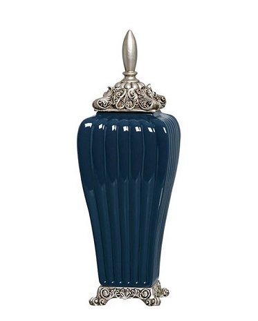 Potiche cerâmica azul petróleo canelado base e tampa prata